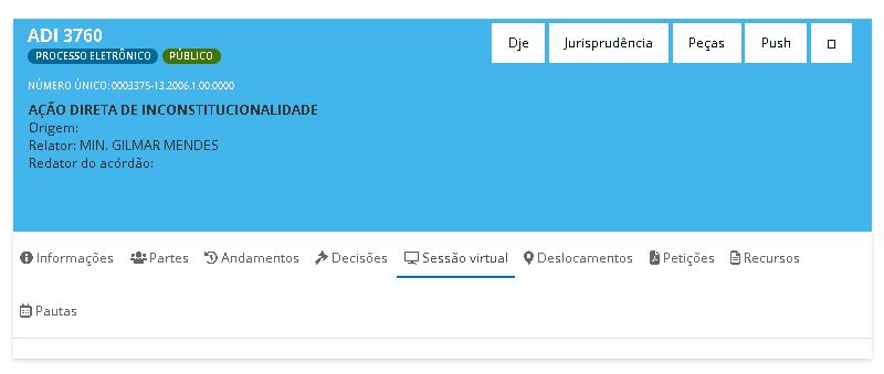 2 – O ícone exibido antes do nome do processo ("Ação Direta de Inconstitucionalidade 3760", no quadro abaixo) indica que o julgamento está em andamento em uma sessão virtual. O resultado da votação fica disponível desde o início da sessão virtual até 48 horas após a sua finalização. Ao clicar no processo, é exibida a votação em tempo real.